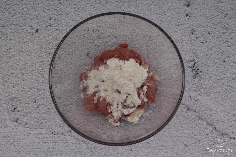 1. Свинину вымыть и нарезать небольшими продолговатыми брусочками. Брусочки положить в миску. Добавить муку и все вместе перемешать.