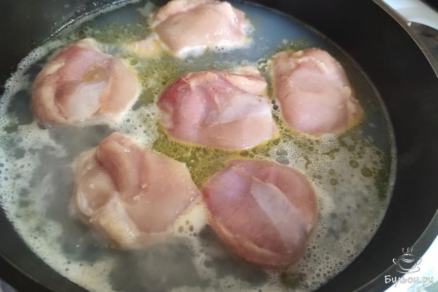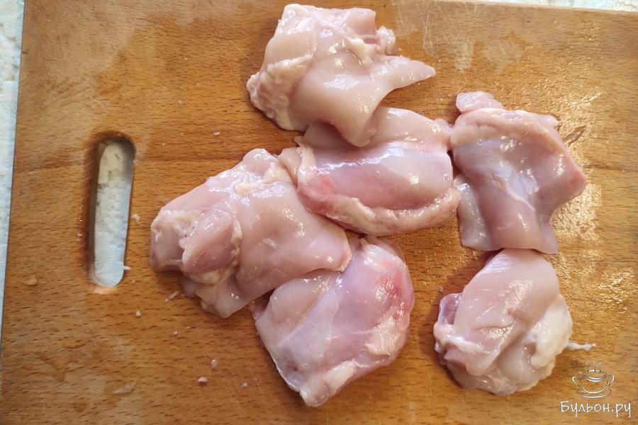 1. Крупные бедра промыть, обсушить. Снять кожу, вырезать кости. Разрезать мясо от каждого бедра на 2 части. Посыпать солью.
