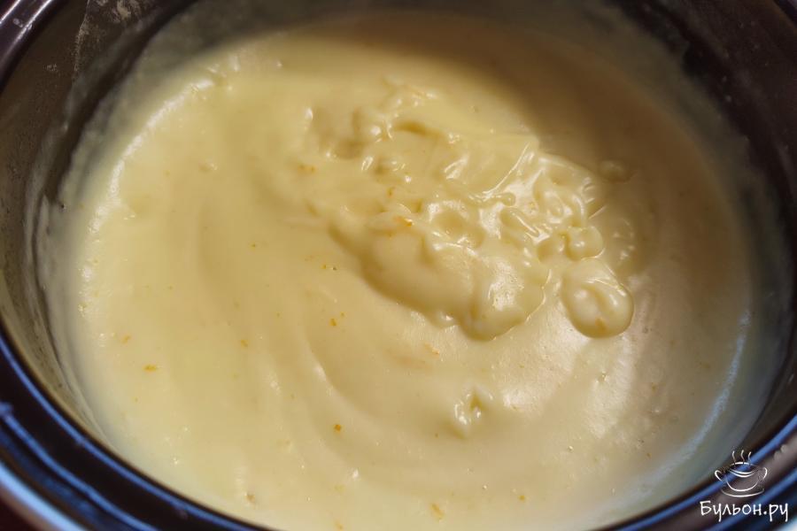 8. Молоко прогреть на плите, но не доводить до кипения. Вылить половину молока в ингредиенты, подготовленные для крема, перемешать. Затем эту смесь вернуть в кастрюлю к оставшемуся молоку.