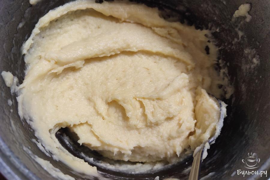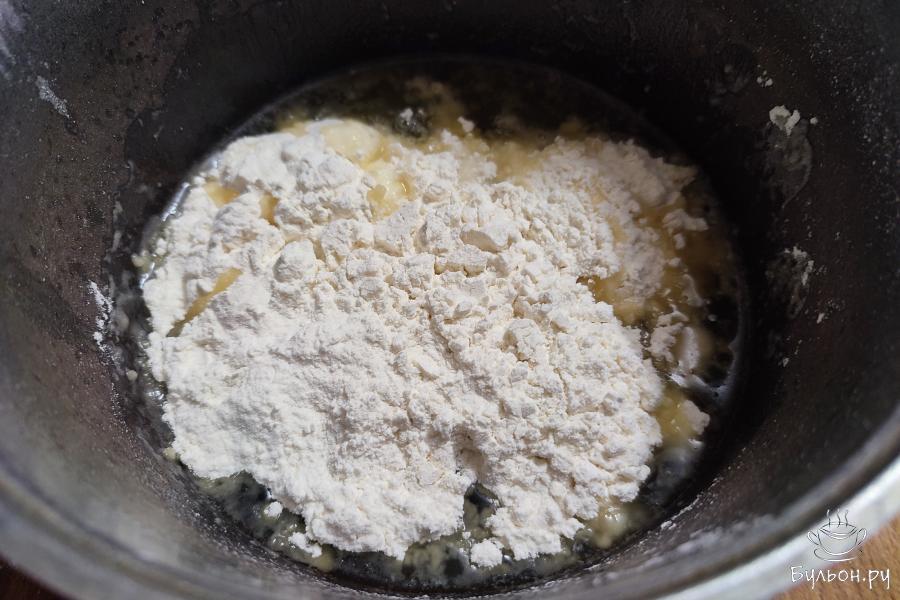 2. Высыпать 140 г муки, тщательно размешать. Проварить тесто несколько минут, перемешивая. Остудить тесто, примерно 20 минут.