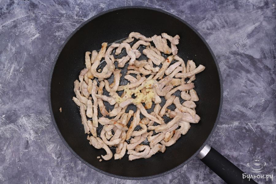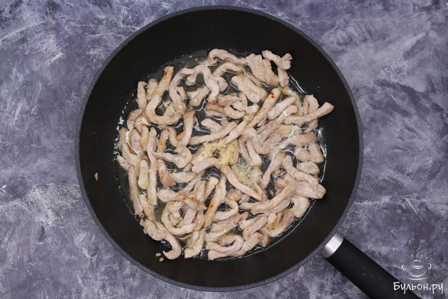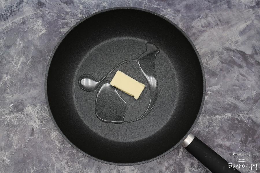 3. В сковороду влить растительное масло и положить кусочек сливочного. Растопить его. Обжарить на сковороде на сильном огне кусочки свинины.