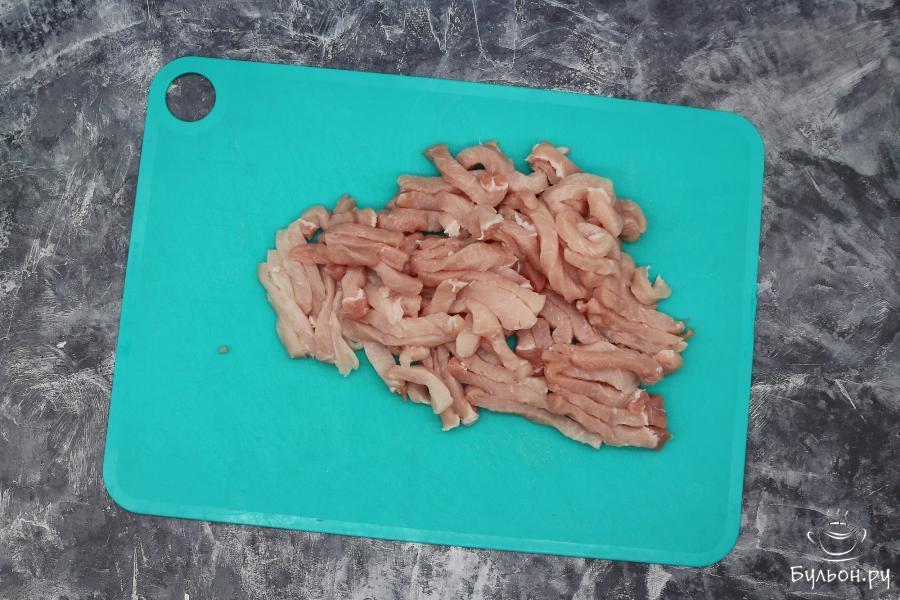 1. Свинину вымыть, срезать весь жир, если он есть и нарезать небольшими продолговатыми брусочками. Брусочки положить в миску.