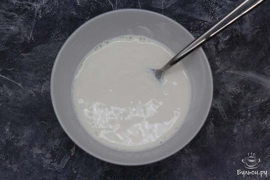 2. В стакан или другую небольшую емкость влить молоко из холодильника, добавить крахмал и тщательно вымешать. Крахмальное молоко добавить с сметану и еще раз тщательно вымешать все ингредиенты.