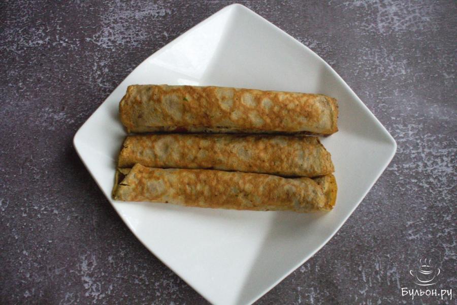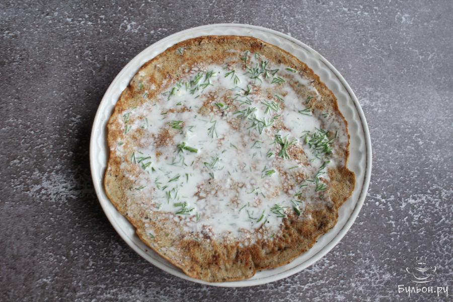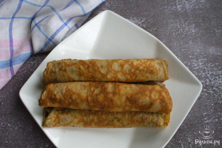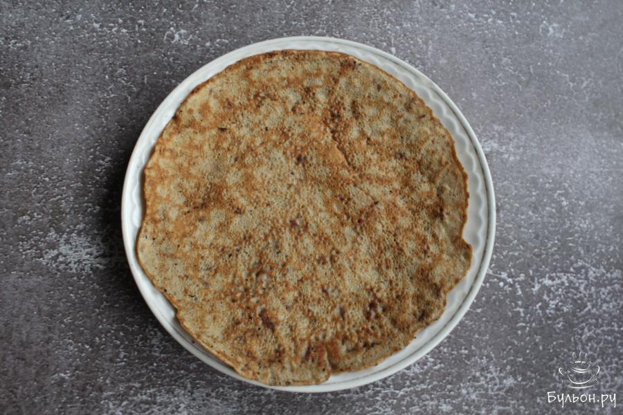 5. Пожарить блины на сухой разогретой сковороде по 2 минуты с каждой стороны. Выложить блин на тарелку.