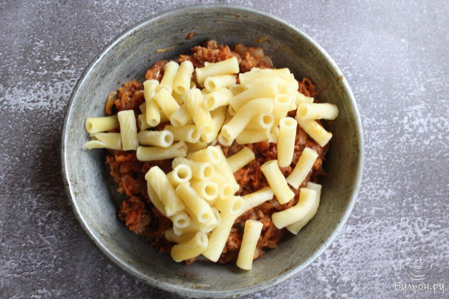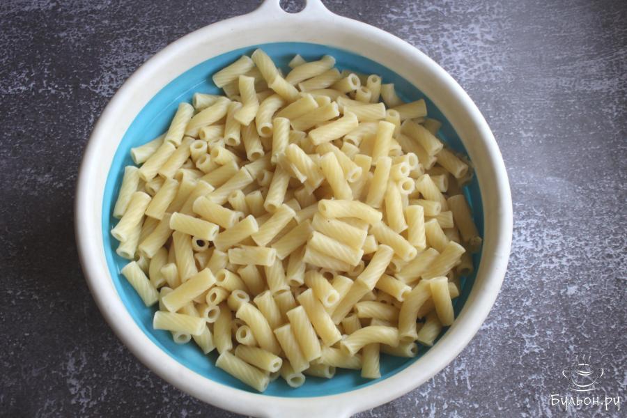 1. Макароны сварить до готовности в подсоленной воде и откинуть на дуршлаг. Время приготовления зависит от формы макарон, ориентируйтесь на рекомендации, указанные на упаковке.