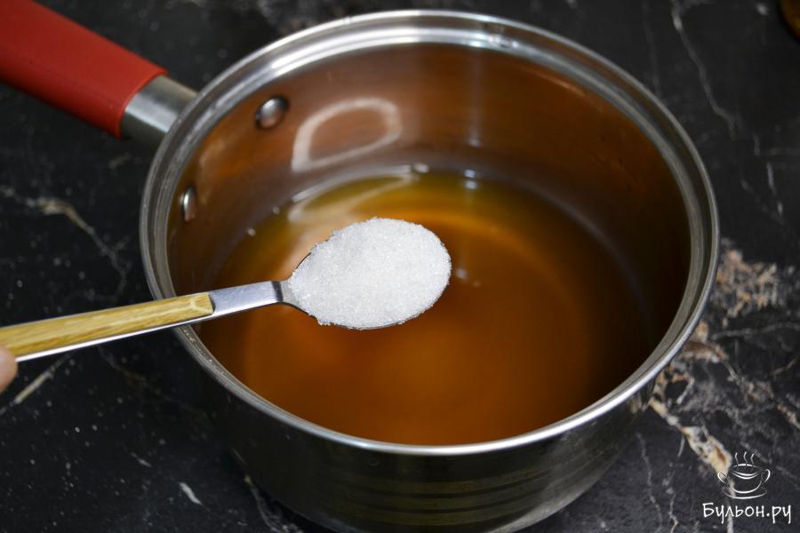 6. Для маринада: сок от перца перелить в небольшую кастрюльку и добавить сахар, соль, растительное масло. Размешать, чтобы сахар и соль растворились.