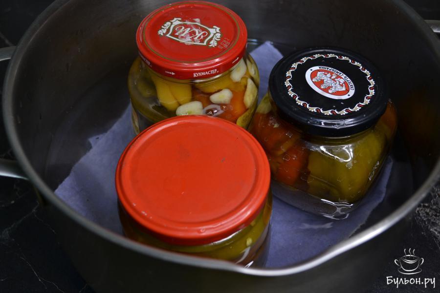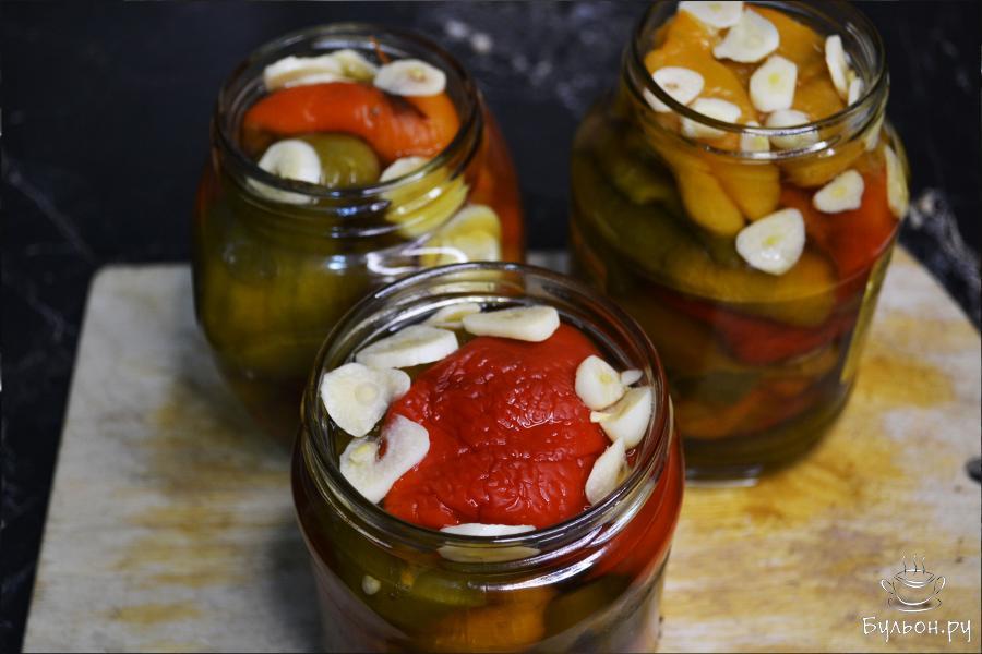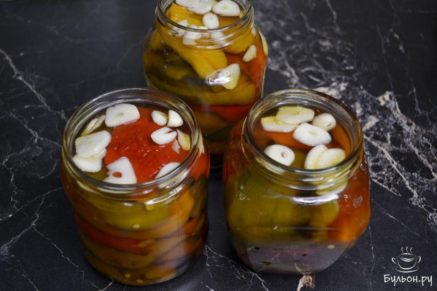 7. Залить маринадом баночки с перцем до самого верха и положить нарезанный чеснок. Если не хватило сока от запеченного перца, то в маринад можно добавить горячую воду.
