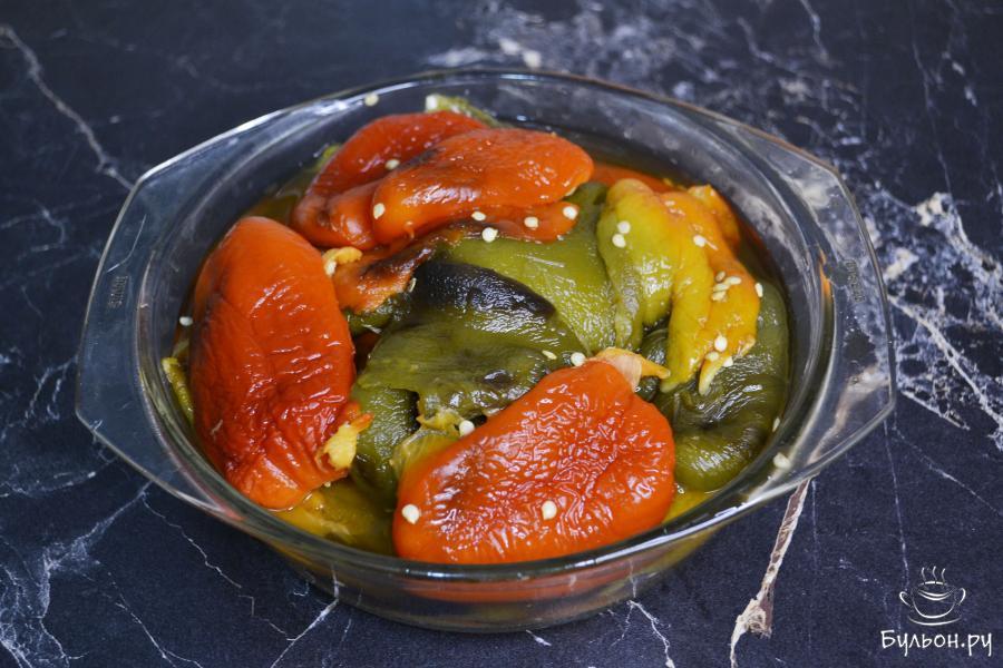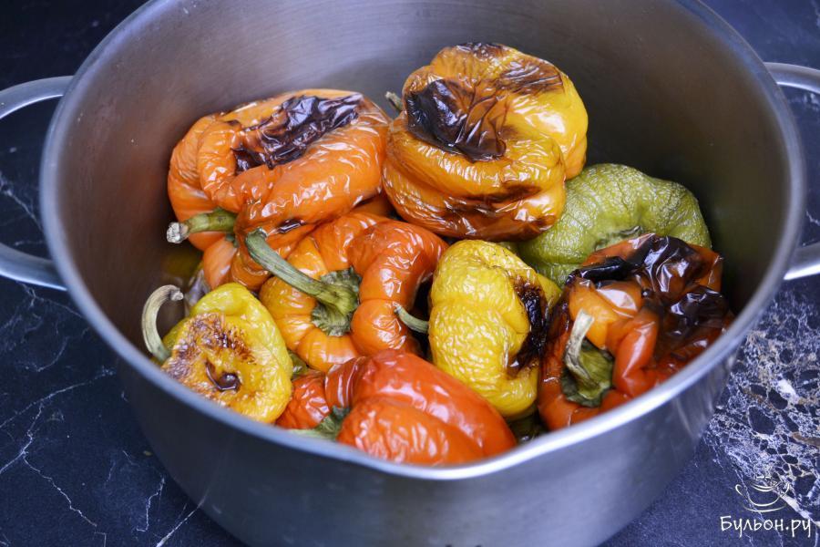 3. Горячий запеченный перец переложить в кастрюлю и закрыть ее крышкой. Оставить так перец на 10-15 минут.