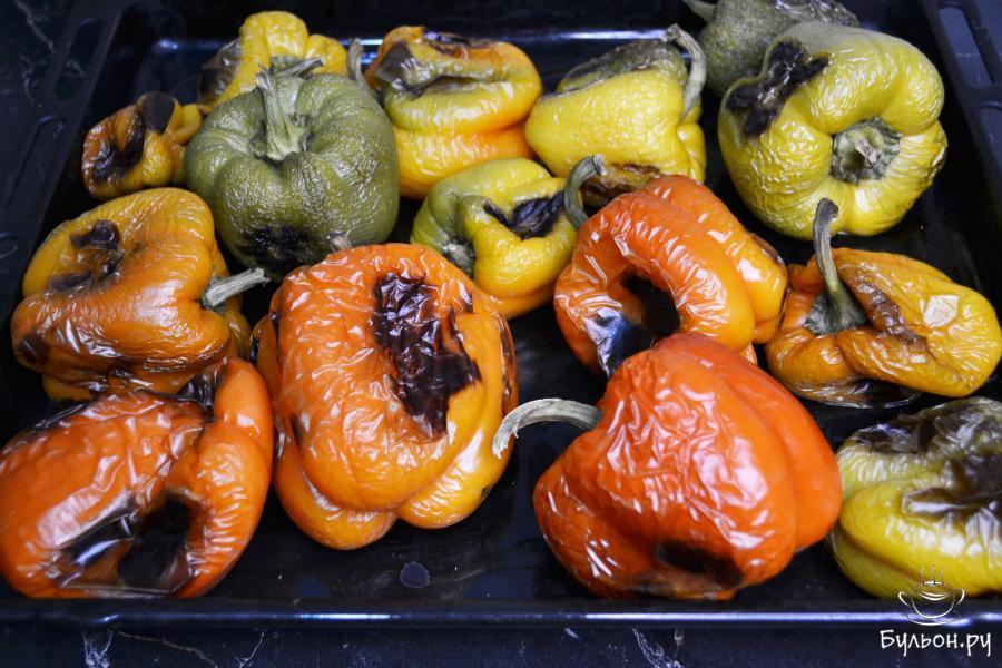 2. Поставить противень в разогретую до 190-200 градусов духовку и запекать перец до подпалин, примерно 30-40 минут. За время запекания, обязательно переворачивайте перец, чтобы он запекся во всех сторон.