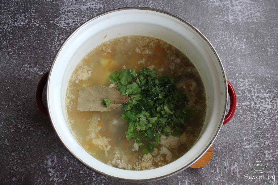 6. Добавить в суп лавровый лист измельченную петрушку и соль. Варить суп еще 2-3 минуты. Убрать кастрюльку с огня.