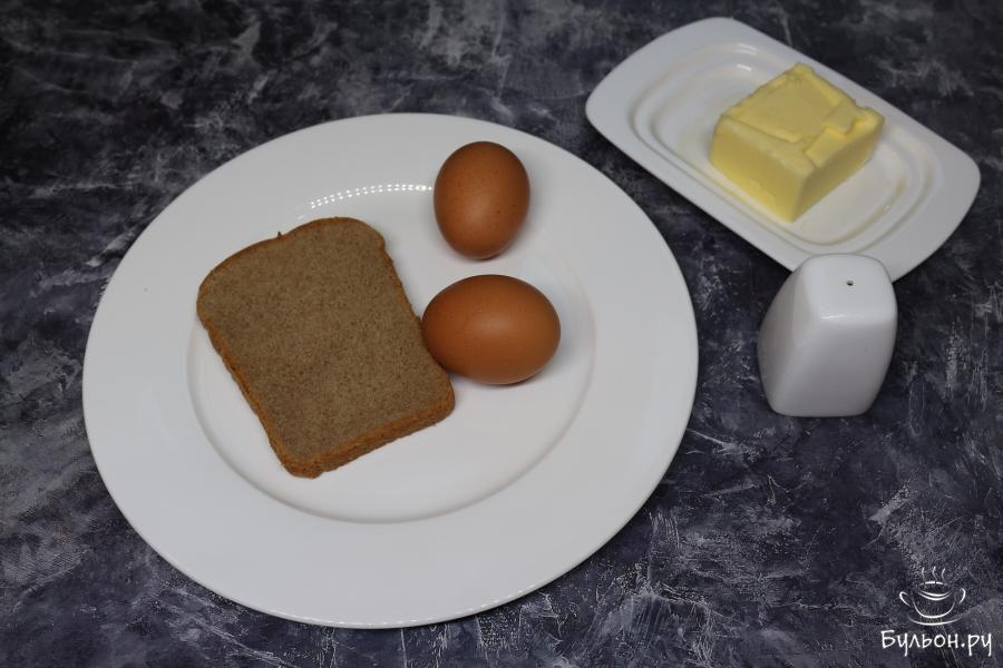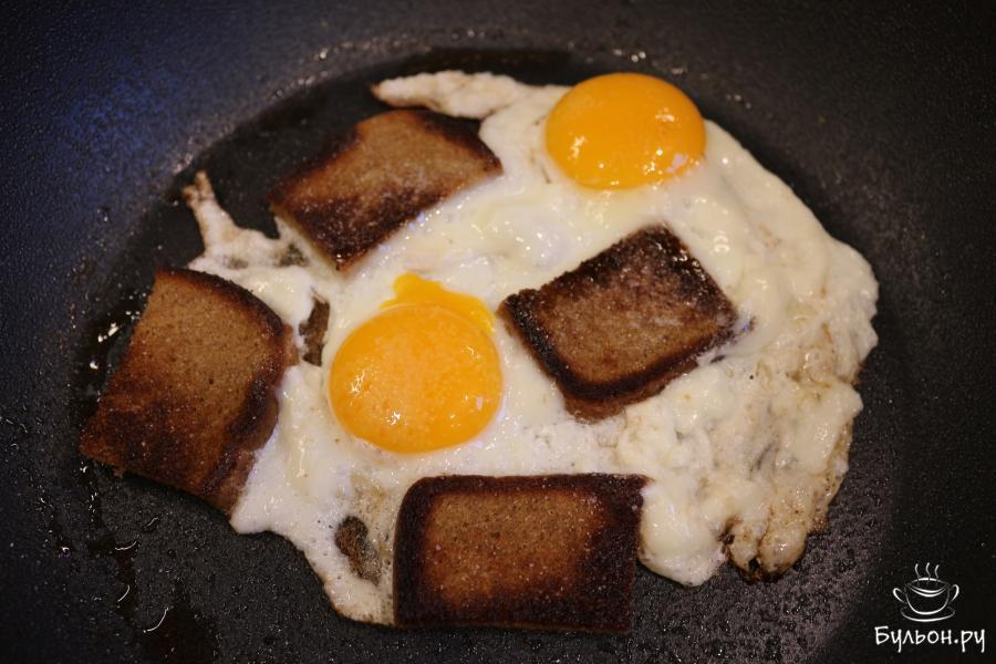5. Затем перевернуть кусочки хлеба, вбить в сковороду яйца, яичницу посолить. Жарить еще пару минут.