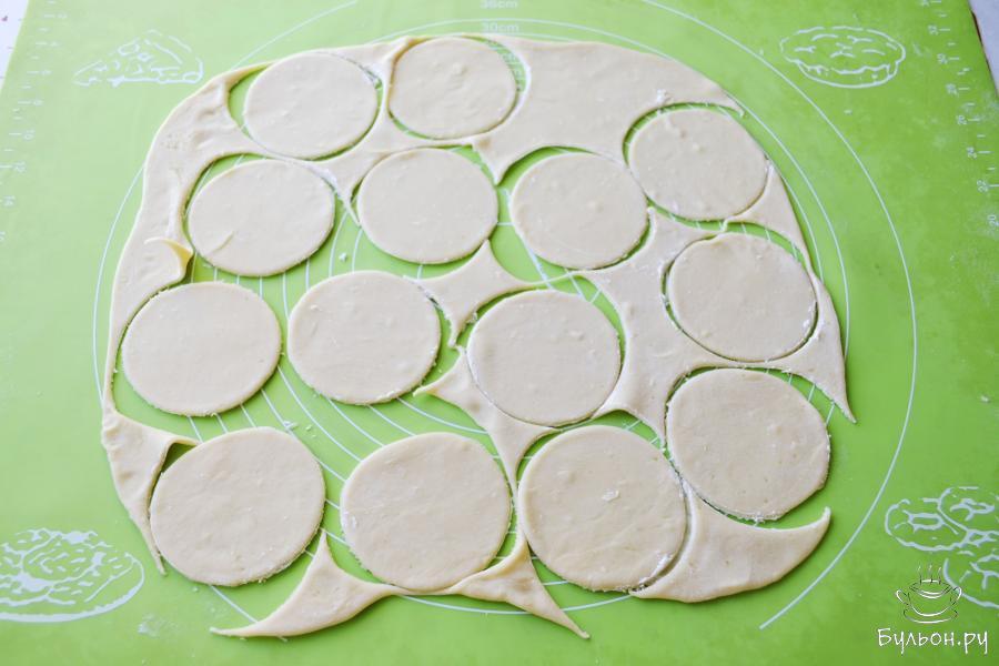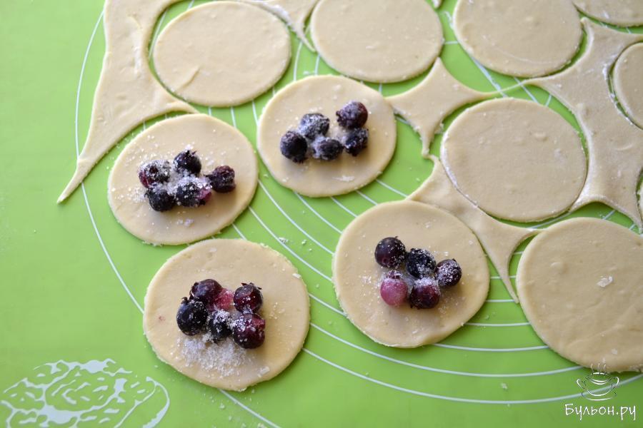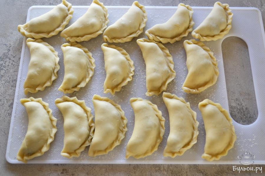 9. Доску немного присыпать мукой и положить на нее готовые вареники. В таком виде вареники можно поставить в морозильную камеру. А после того, как они замерзнут, переложить в пакет.