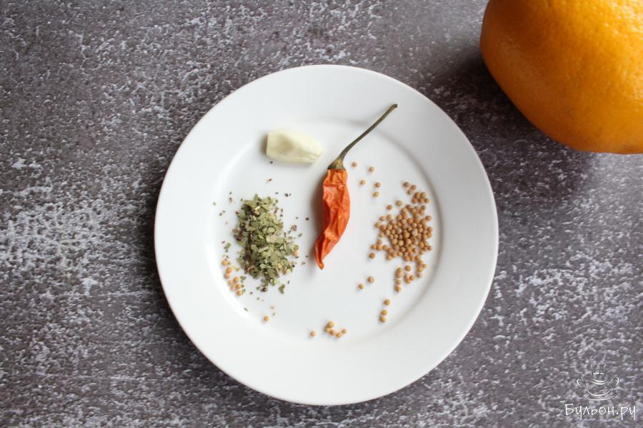 2. Выложить в сотейник или кастрюльку с маслом горчицу, орегано, острый перец, чеснок, цедру лимона и прогреть 3-4 минуты.