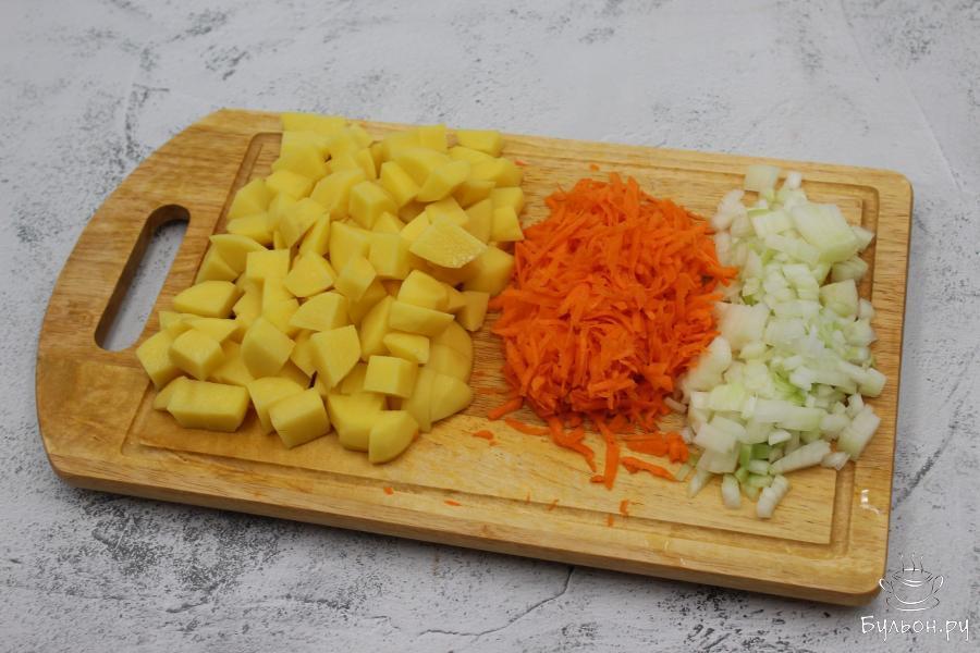 3. В это время подготовить овощи. Очистить их, картофель и лук нарезать кубиками, морковь натереть на средней терке.