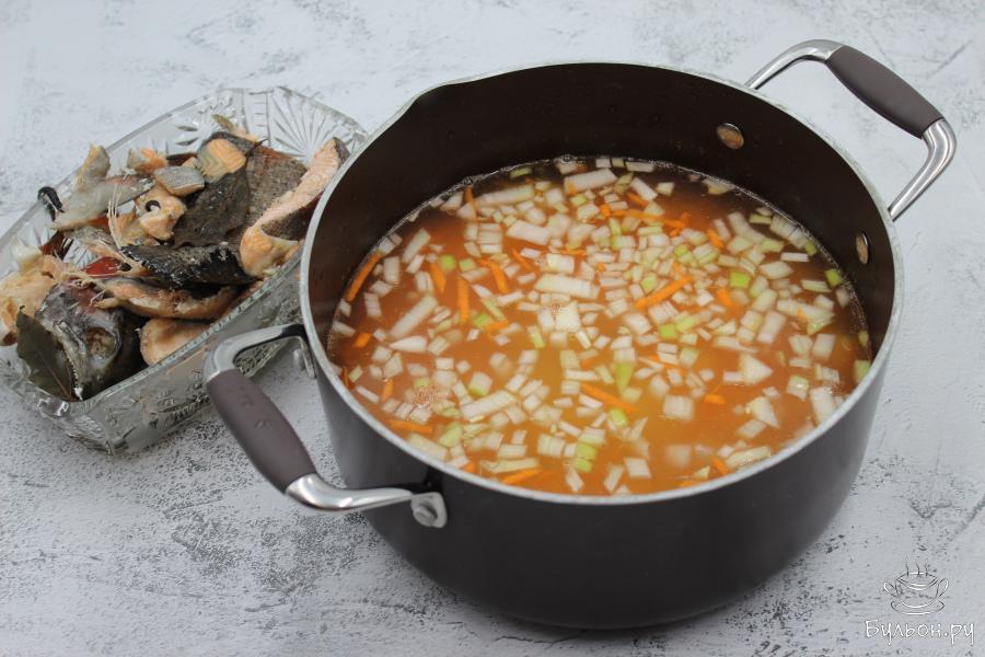 4. По истечении получаса достать из бульона рыбу, а сам бульон процедить в чистую кастрюлю. В процеженный бульон выложить овощи и довести до кипения, после чего варить суп примерно 20-30 минут. Картофель попробуйте на готовность.