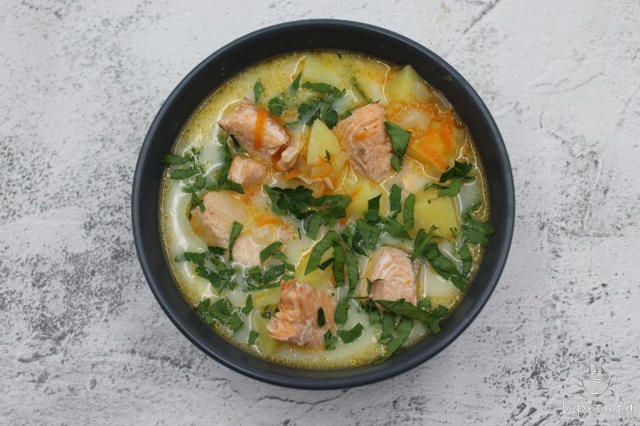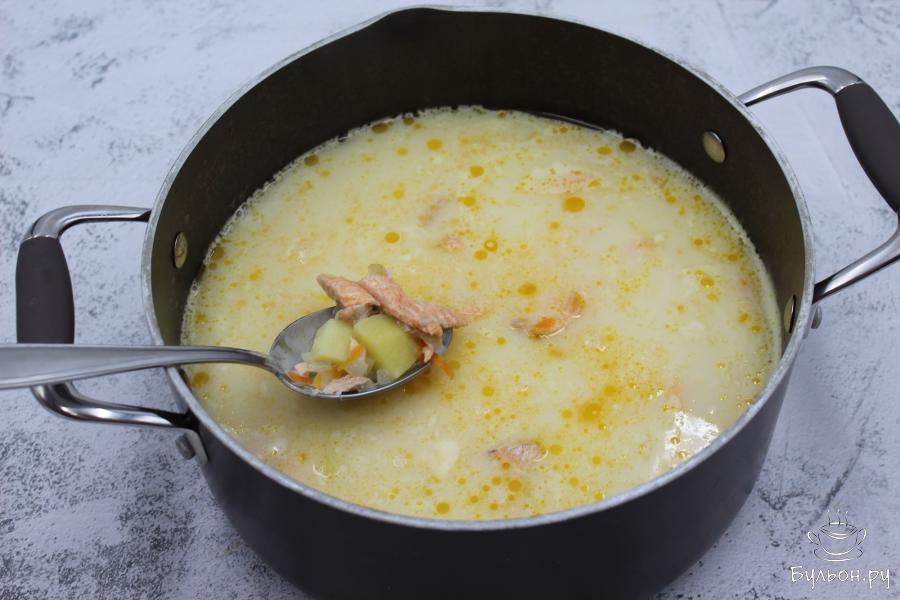 6. Когда картофель будет готов, добавить в бульон плавленый сыр, полностью его растворить. Затем выложить кусочки форели и дать супу прокипеть 1 минуту.