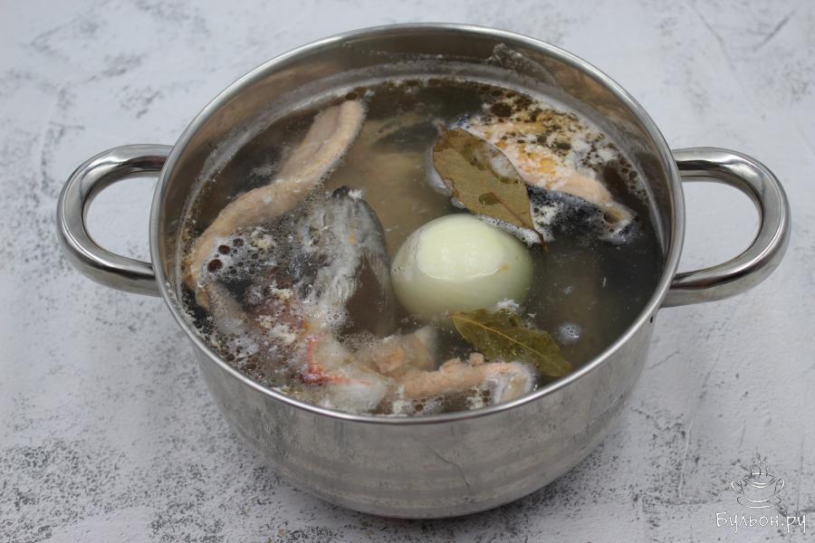 2. Добавить в кастрюлю очищенную целую луковицу, лавровый лист, душистый перец, морскую соль. Варить бульон под закрытой крышкой в течение 30 минут.