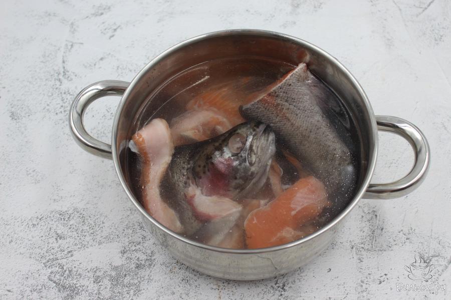1. Вымытую под водой рыбу переложить в кастрюлю и залейть водой. Поставить кастрюлю на огонь, довести воду до кипения и снять пену.
