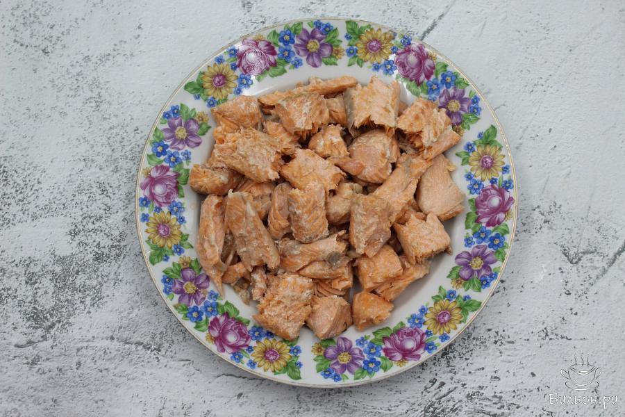 5. В это время разобрать форель, удалив косточки, хожу и другие ненужности, оставить только филейные части, которые затем нарезать на кусочки.