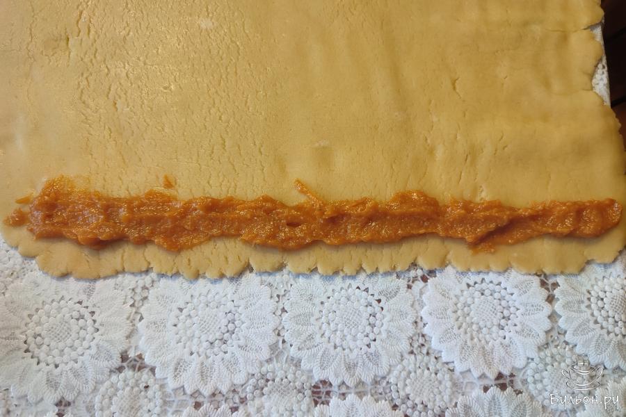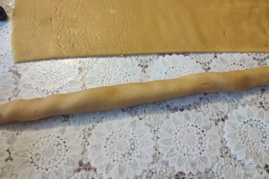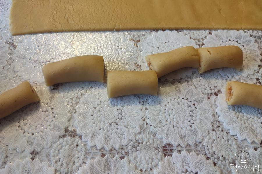 6. Свернуть в рулет, сделав один оборот вокруг начинки. Обрезать лишнее тесто. Далее, повторить все заново.