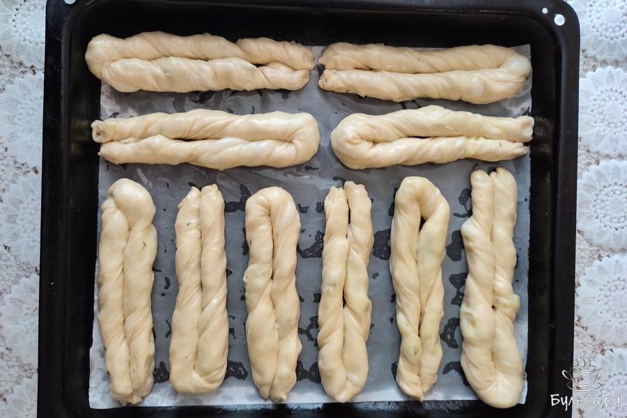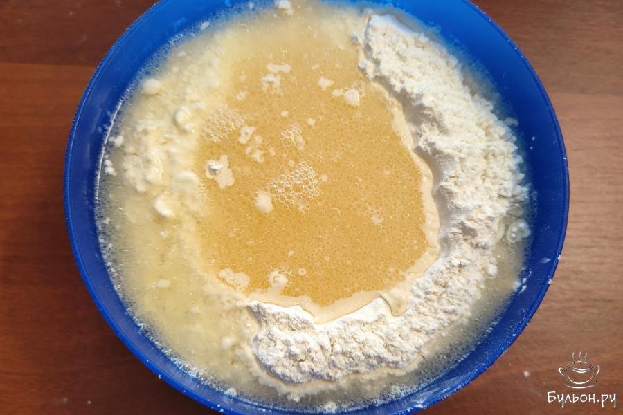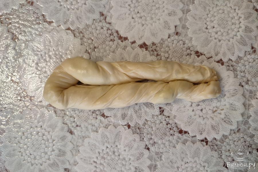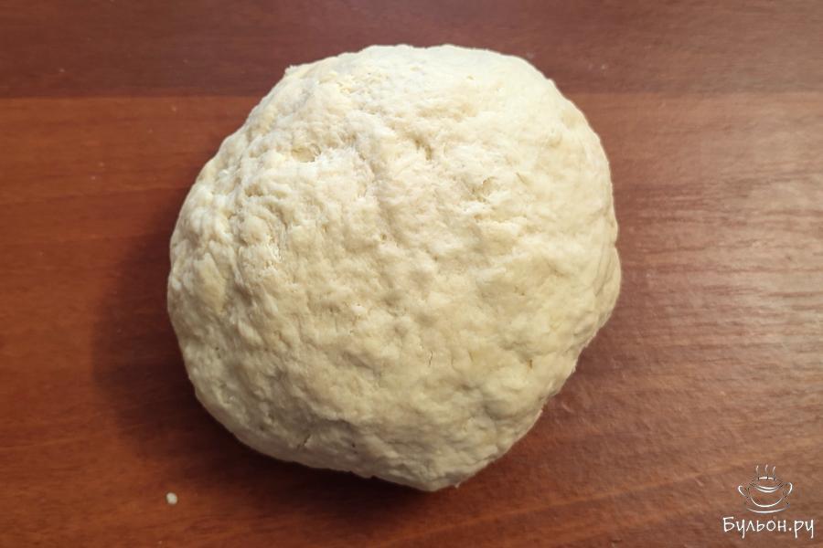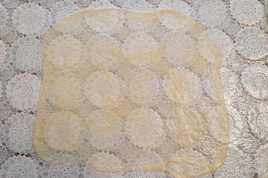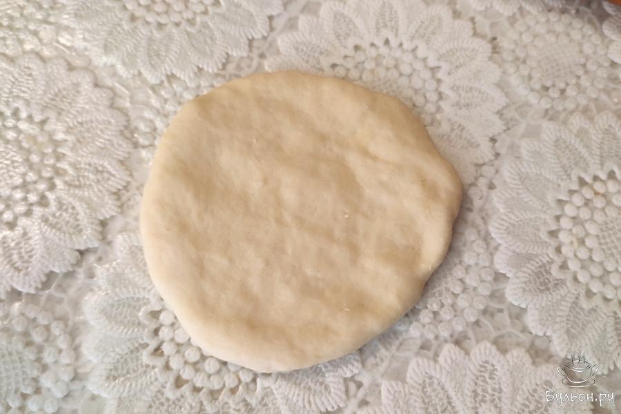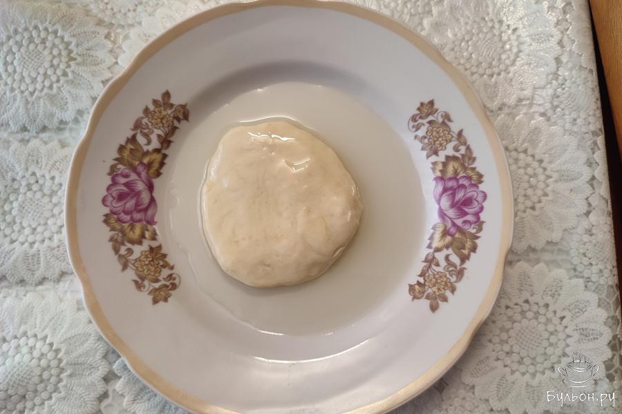 12. Смазать рабочую поверхность 1 ст. л. масла. Смазанными в масле руками, от середины к краям растянуть аккуратно лепешку на столе.