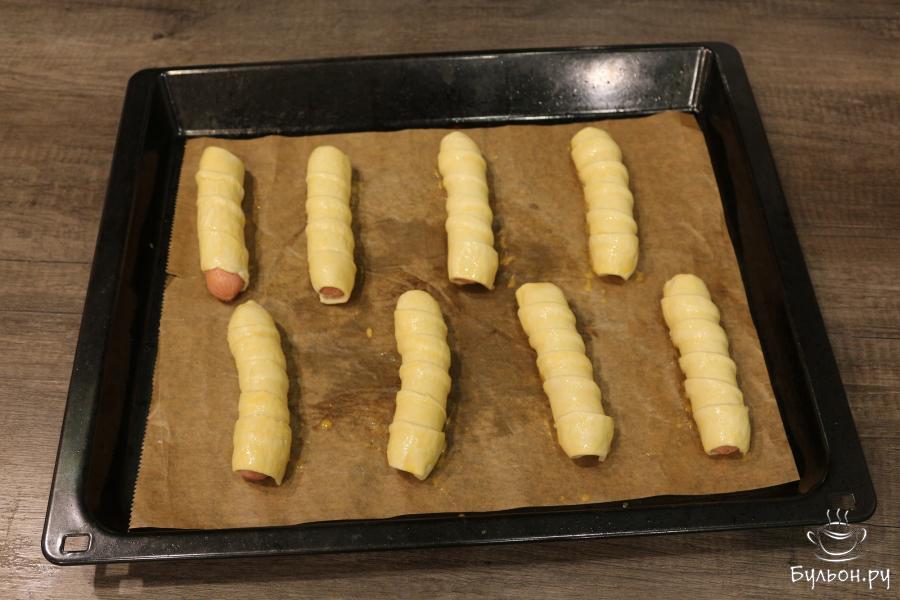 3. Сосиски очистить от пленок. Каждую из них обернуть кусочком теста так, чтобы по узору получилась спиралька из теста.