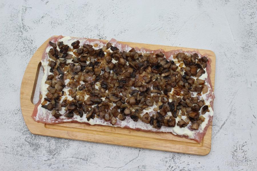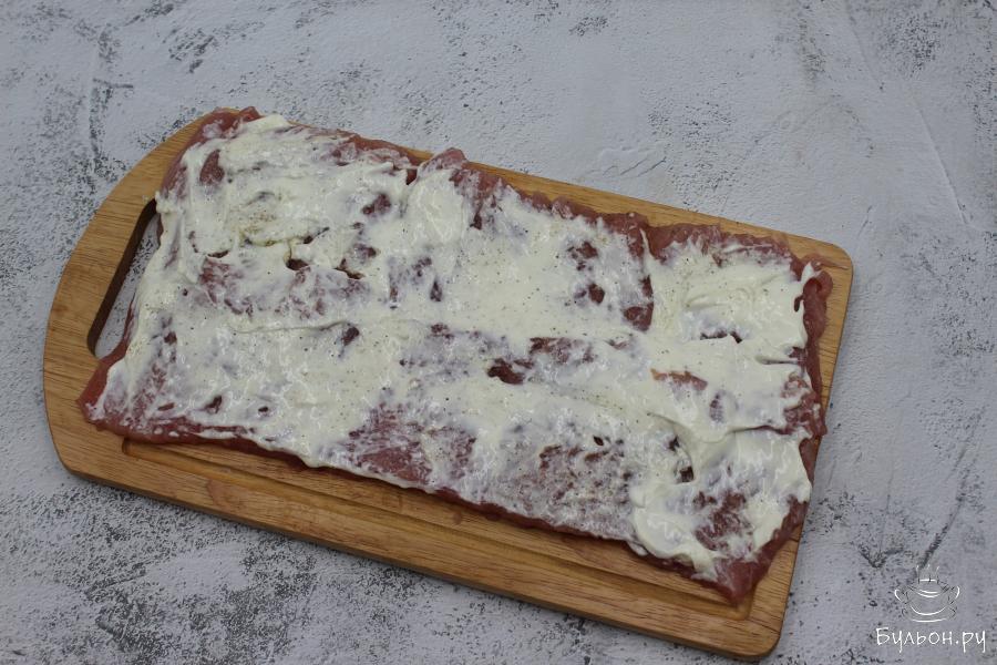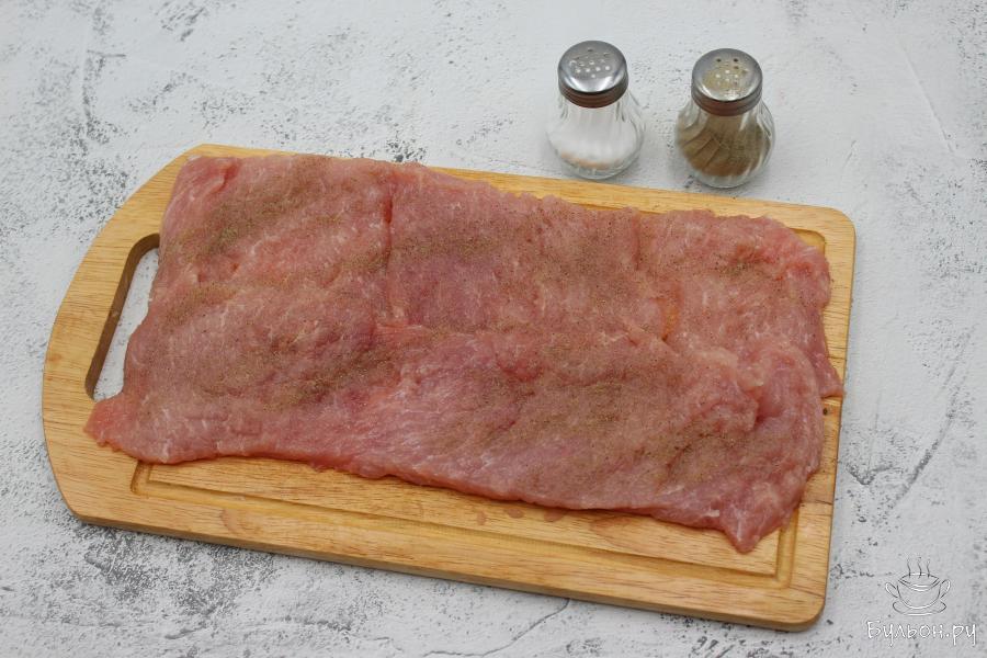 1. Вымытый карбонад разрежьте по спирали, чтобы получился большой пласт мяса. Отбейте молотком, поперчите и посолите.
