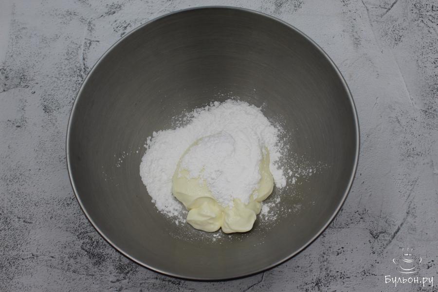 3. В чашу для взбивания к размягченному сыру всыпать сахарную пудру и добавить ванилин на кончике ножа. Я не рекомендую заменять ванилин ванильным сахаром, поскольку такого насыщенного вкуса Омички вы не получите. А еще лучше используйте, как и я, ванилин-интенсив.