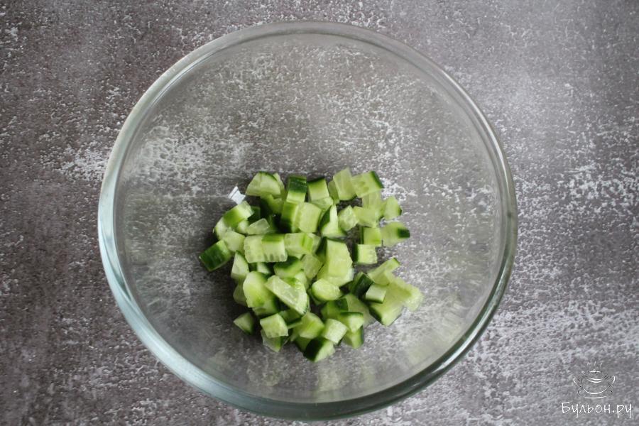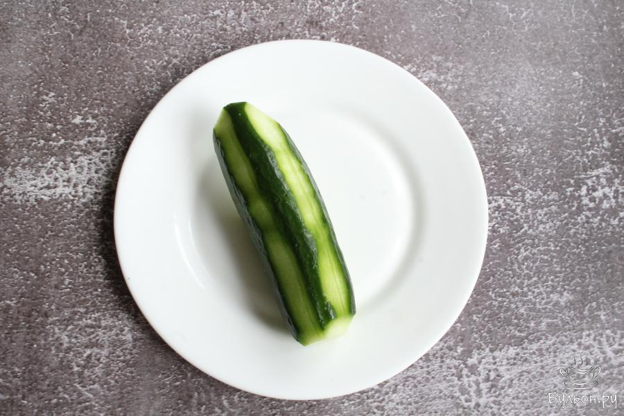 1. Огурцы промыть, обсушить и почистить полосками. Полоску кожицы с огурца снять, следующую полоску кожицы оставить и так по кругу.