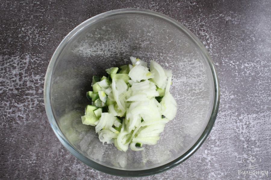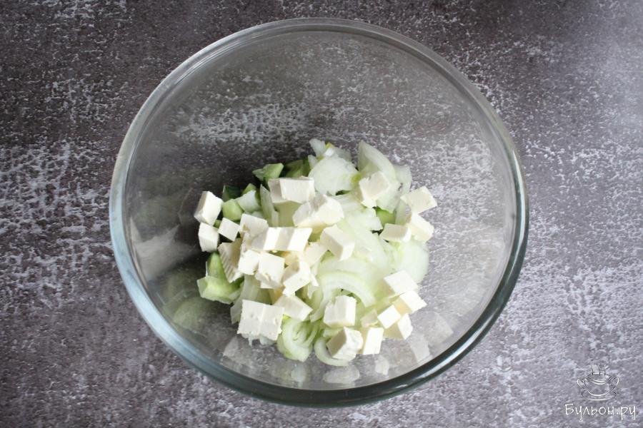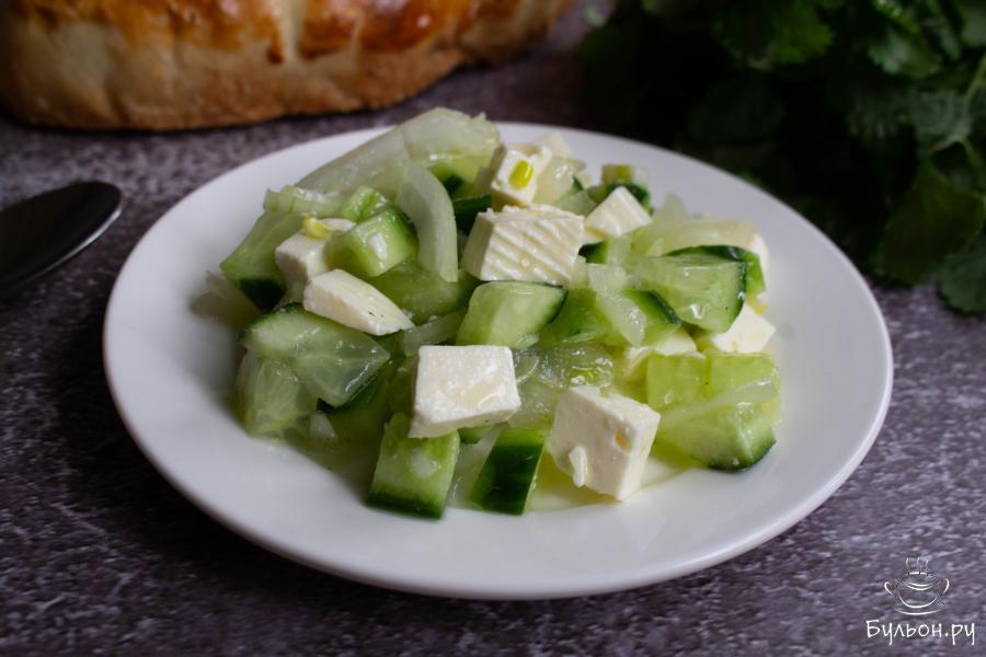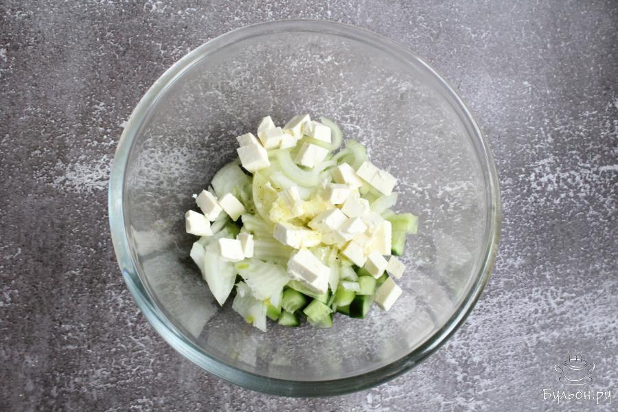 Салат из свежих огурцов, сыра фета и лука в лимонной заправке - это легкий, сочный, нежный и вкусный салат, который можно подать как к повседневному столу, а также вполне можно предложить в разгрузочные дни. Такой полезный салат готовится за считанные минуты из доступных продуктов. Если под рукой нет сыра фета, то его можно заменить на брынзу. По желанию, в этот салат можно добавить немного мяты, если вы любите в салатах мятные нотки.