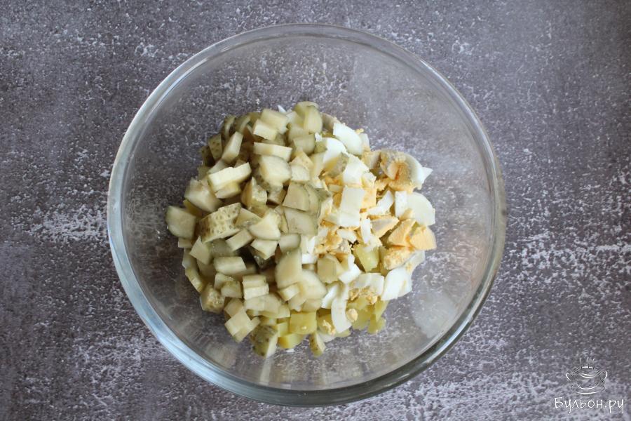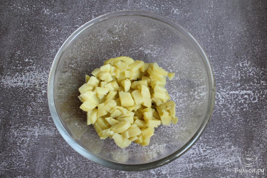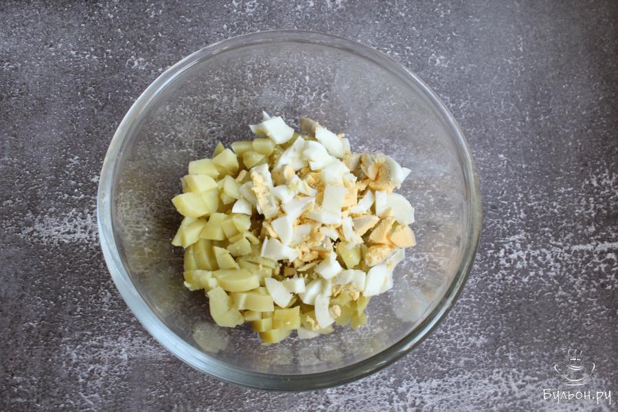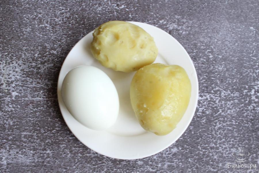 1. Картофель сварить до готовности 20-25 минут, остудить и почистить. Яйцо сварить вкрутую 10 минут после закипания воды, остудить и почистить.
