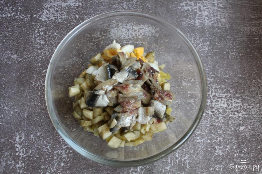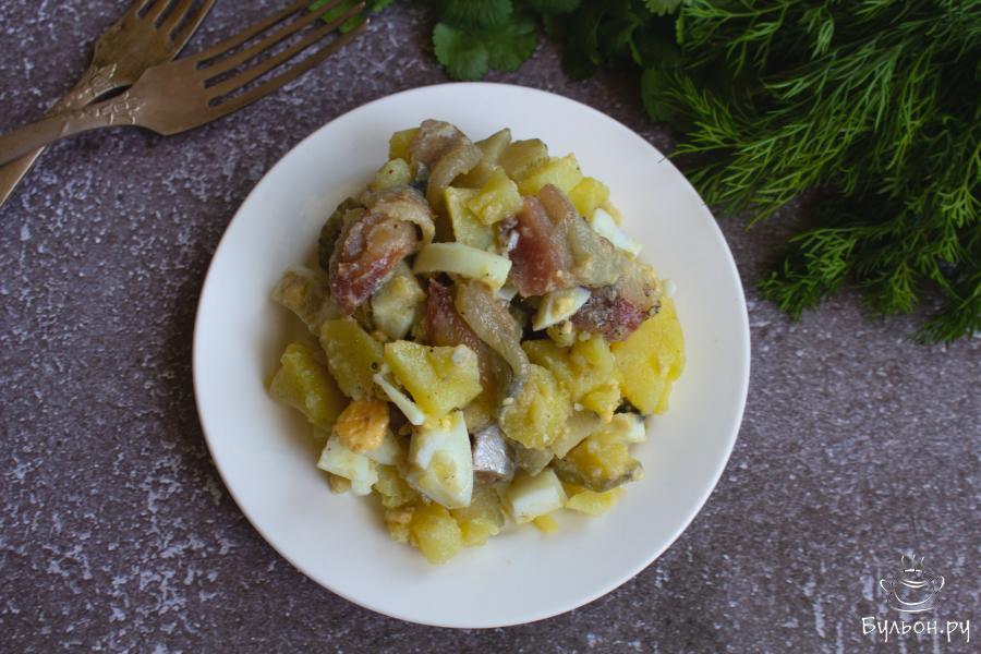 Картофельный салат с малосольной килькой и яйцом получается очень нежный, сытный, пикантный и вкусный. Все любители рыбных салатов будут довольны его вкусом. Готовится салат очень просто и быстро. Порцией такого салат вполне можно заменить ужин. Кильку для приготовления можно брать и сильно соленую, и малосольную, это по-вашему вкусу. Салат можно дополнить любимой измельченной душистой зеленью, мелко нарезанным репчатым луком и каждый раз получить новый вкус.