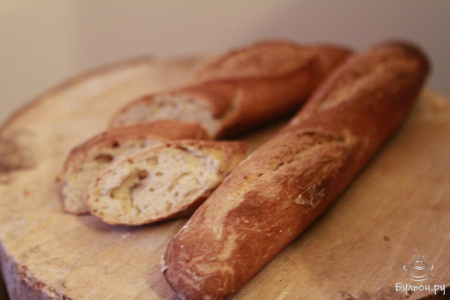 10. Разогреть духовку до 230 градусов. Сделать надрезы на багетах. Выпекать 30-35 минут при 220 гр, установив на дно духовки чашу с водой. Готовые багеты остудить.