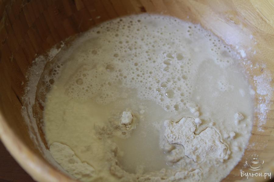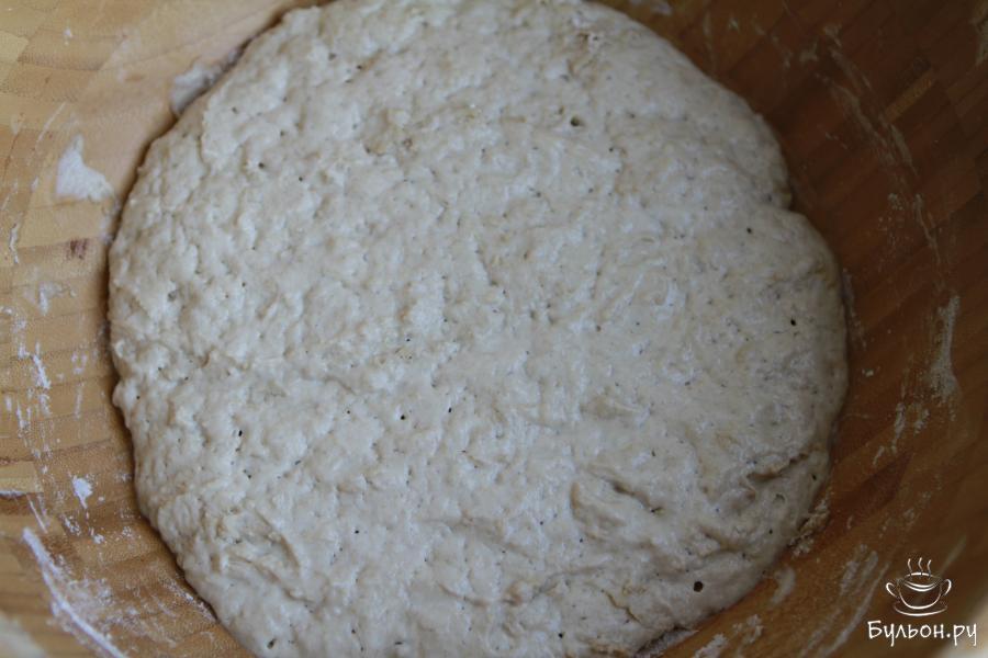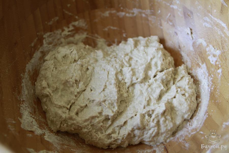 4. Все ингредиенты хорошо перемешать между собой. Тесто по консистенции получится очень липким. Чашу с тестом накрыть пищевой пленкой и убрать на 12 часов.