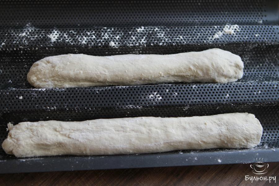 9. Разделить его на две части и из каждой сформировать небольшой багет. Уложить в форму. Оставить на расстойку багеты на 30 минут.