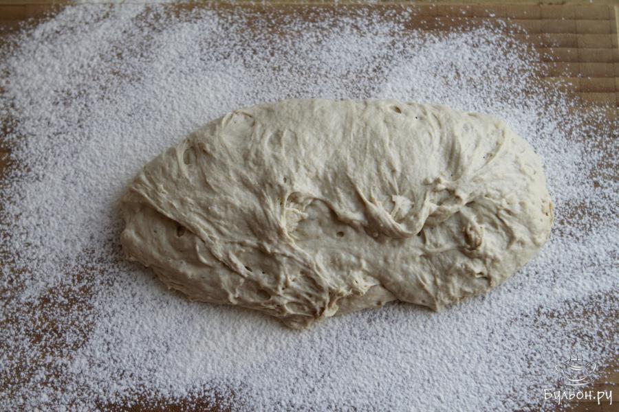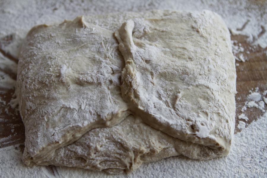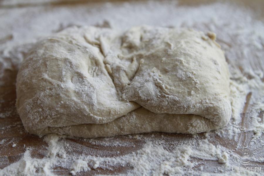 8. Аналогичным способом сложить верхний и нижний края к центру. Повторить процедуру дважды. Тесто возьмет нужное количество муки, не будет плыть и хорошо будет держать форму.
