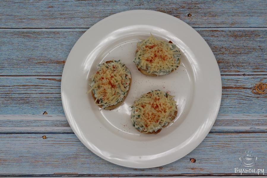 Мини тосты с сырно-шпинатной начинкой - это кусочки хрустящего багета с невероятно нежной сливочно-шпинатной начинкой и тертым твердым сыром, украшенные молотой паприкой. Готовится рецепт всего лишь за 15 минут и нежное, мягкое и в то же время хрустящее удовольствие готово. Отлично сочетается с чаем и кофейными напитками, например, раф, латте, капучино или просто кофе с молоком. Идеально подойдет для перекуса. Вместо паприки, бутерброды можно украсить другой специей или листиками свежей зелени.