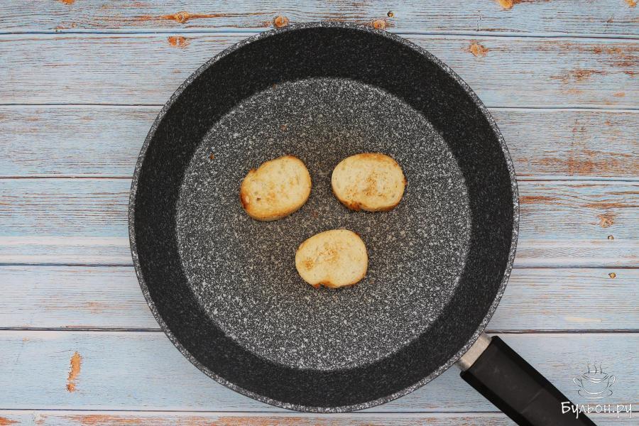 1. От багета отрезать 3 кусочка средней толщины. Подсушить их с двух сторон на сухой сковороде. Остудить их.