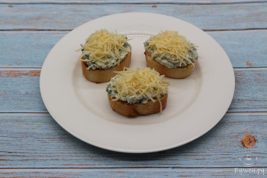 2. Сделать намазку. Смешать сливочный сыр, мелко нарезанный шпинат, измельченный чеснок и соль. На кусочки сушеного багета нанести намазку, разровнять.