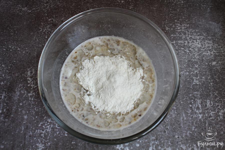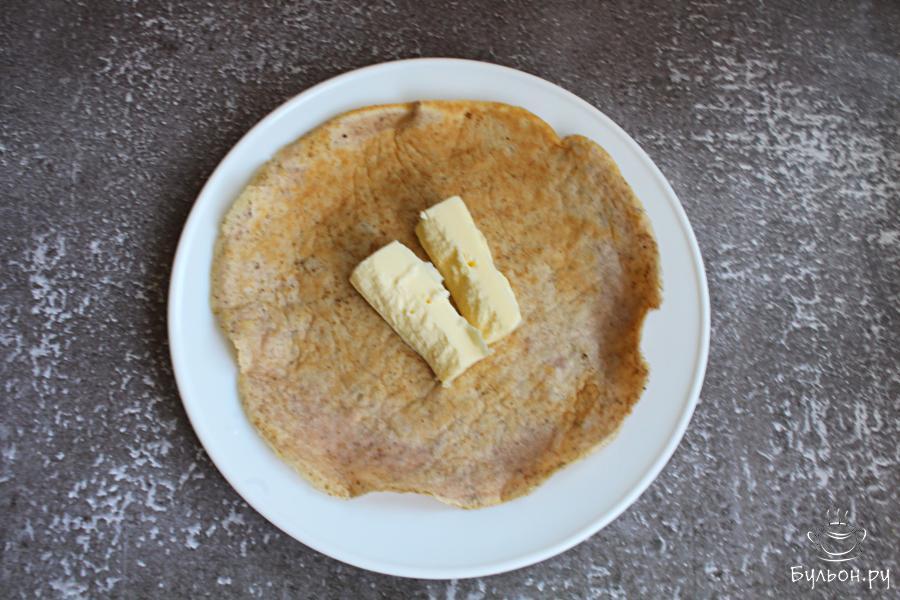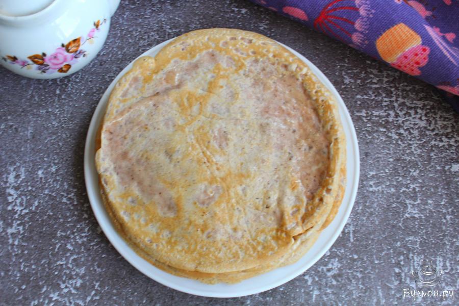 6. Сухую сковороду хорошо разогреть. Вылить на сковороду примерно 2 ст. л. теста. Жарить блинчики с двух сторон, по паре минут с каждой стороны, до румяного цвета.