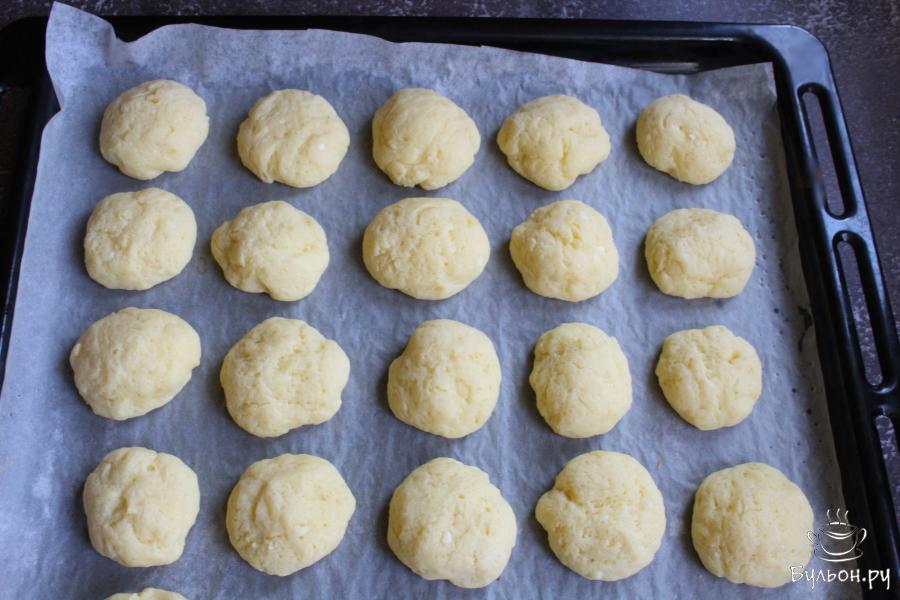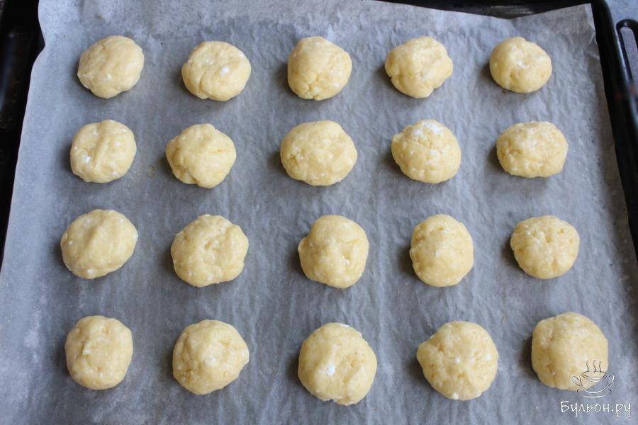 7. Это тесто не липнет к рукам. Сформировать из теста шарики размером примерно с грецкий орех и выложить на противень.