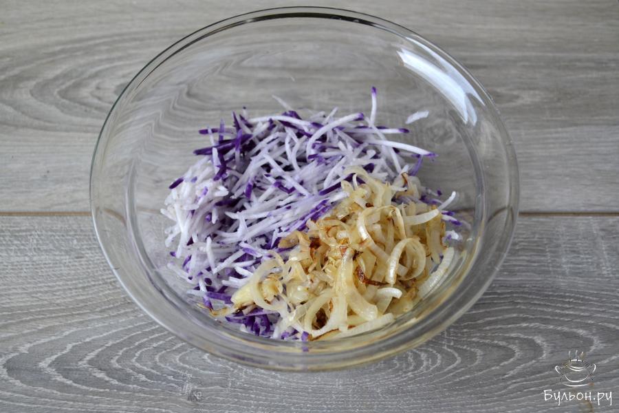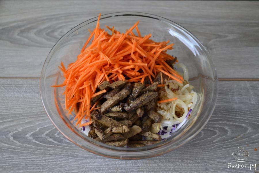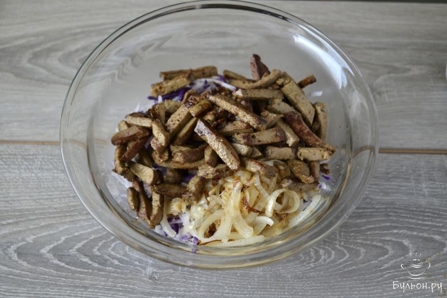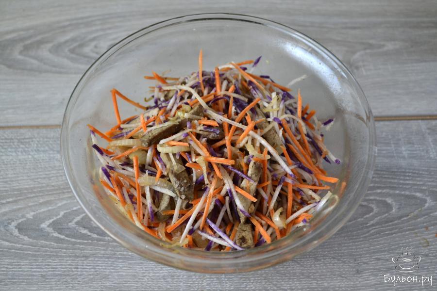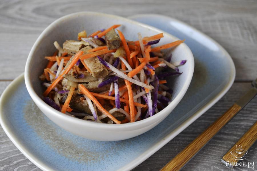 Редька - замечательный корнеплод. В салатах она прекрасно сочетается почти со всеми овощами, а также с мясными продуктами: отварной говядиной или говяжьей печенью. Печень можно только отварить или только обжарить. А можно, как в этом рецепте, сначала отварить, а потом слегка обжарить. Дополнительно заправлять салат ничем не нужно. Будет достаточно того растительного масла, на котором обжаривался лук и печень. Редьку также можно взять любую: острую черную, зеленую Маргеланскую, дайкон. Сейчас такой огромный выбор этого корнеплода: есть редька с розовой, малиновой кожурой, у меня с фиолетовой. Она не очень острая. Салат получился очень вкусный, сытный, с легкой острой ноткой.