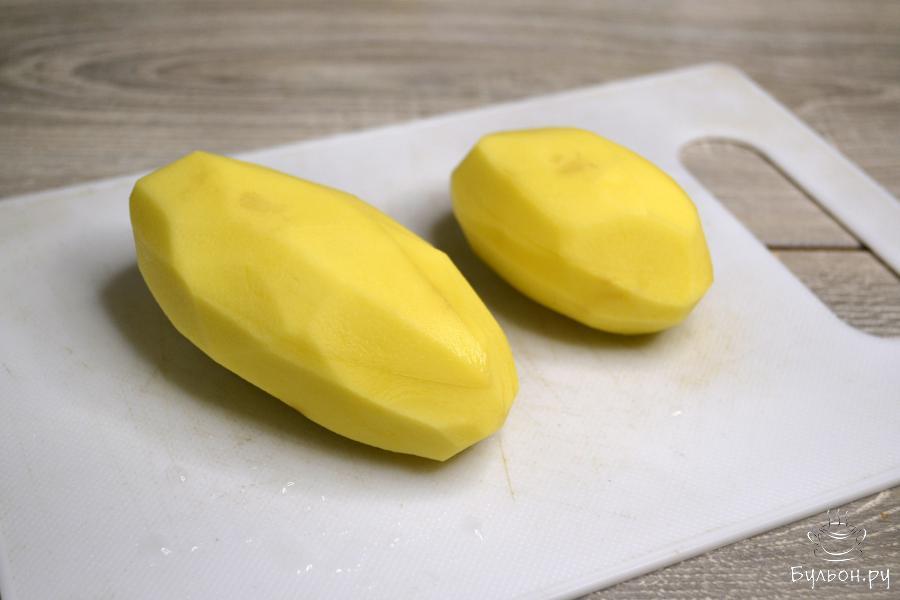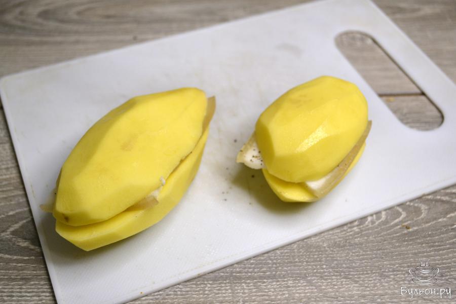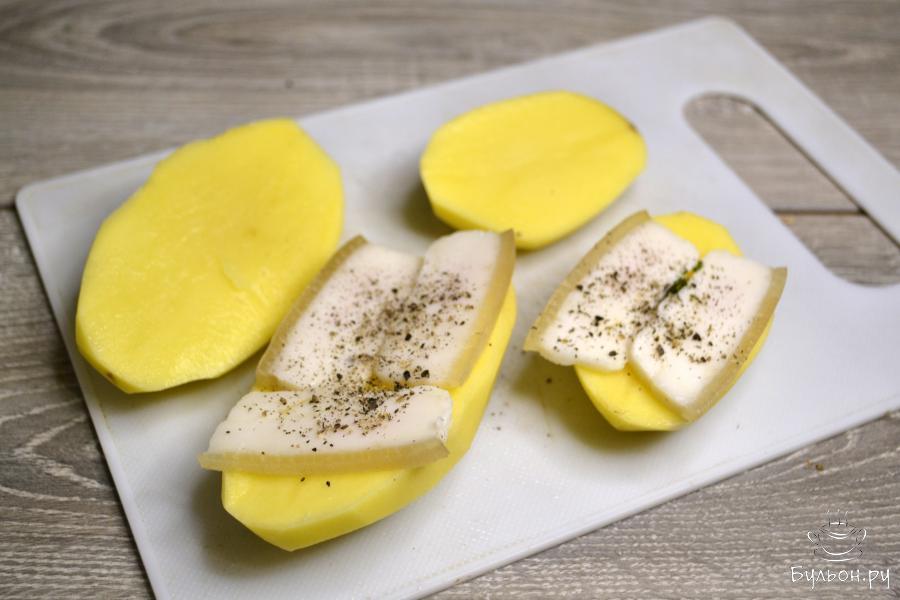 3. Картофель разрезать вдоль на две части. Положить на половинку картофеля сало, посыпать его черным молотым перцем.