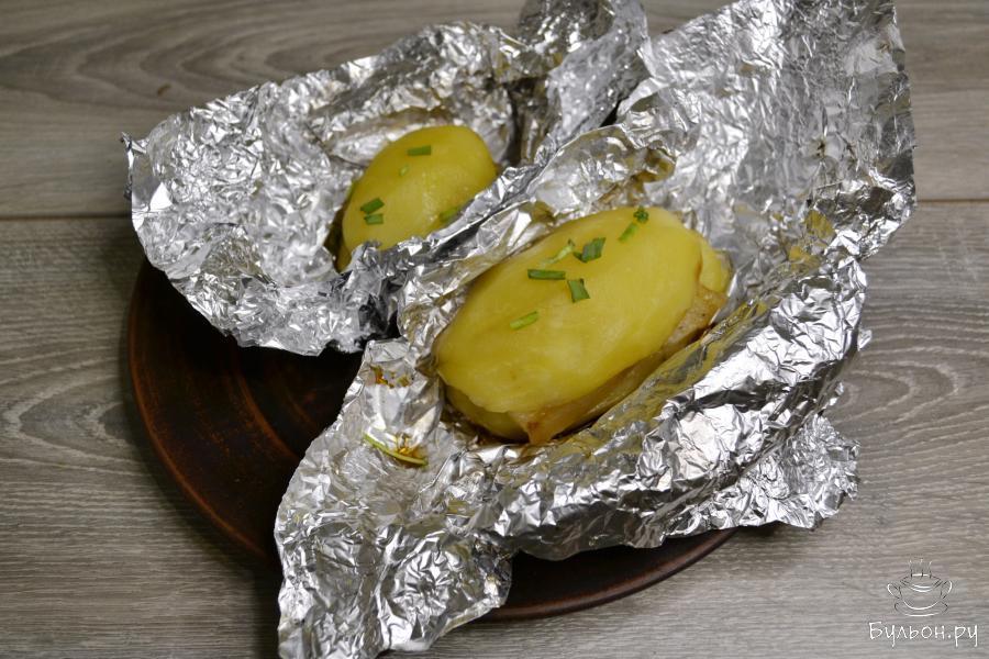 6. Запекать картофель до мягкости, примерно 45-50 минут. Но в любом случае, ориентируйтесь на особенности своей духовки. Подать картошку можно прямо в фольге, посыпав зеленью.
