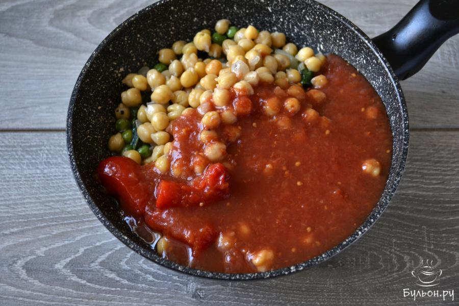 6. Добавьте в сковороду томаты. Это может быть томатный сок, помидоры в собственном соку, маринованные помидоры или мелко нарезанные свежие томаты. В рецепте помидоры в собственном соку. С томатов снимите кожицу, разомните вилкой и положите в сковороду, влейте сок.