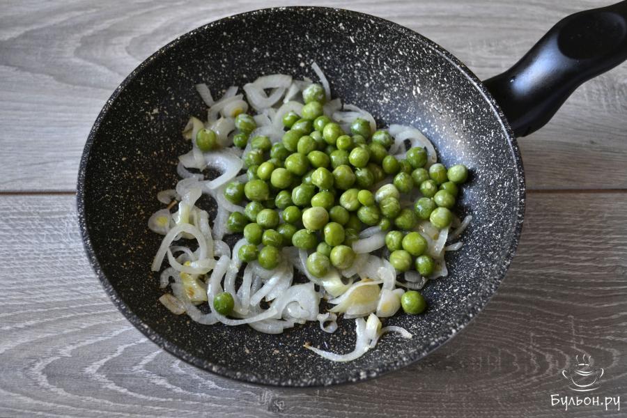 3. Разогрейте сковороду с растительным маслом и положите на нее лук. Обжарьте лук пару минут и добавьте зеленый горошек.