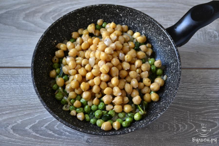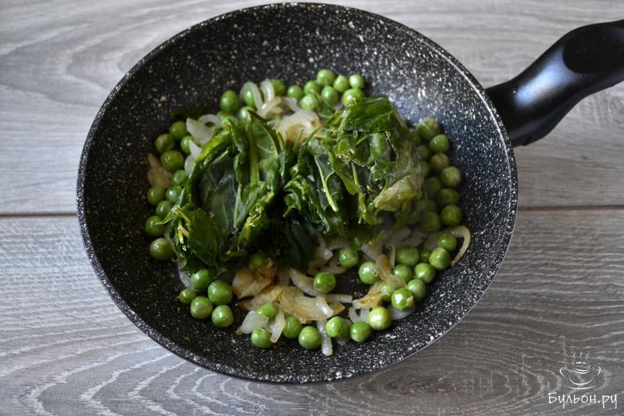4. Следом за горошком отправьте в сковороду шпинат. Перемешайте и обжарьте тоже 2 минуты. Шпинат можно взять свежий или, как в рецепте, замороженный. Замороженный заранее не нужно размораживать.