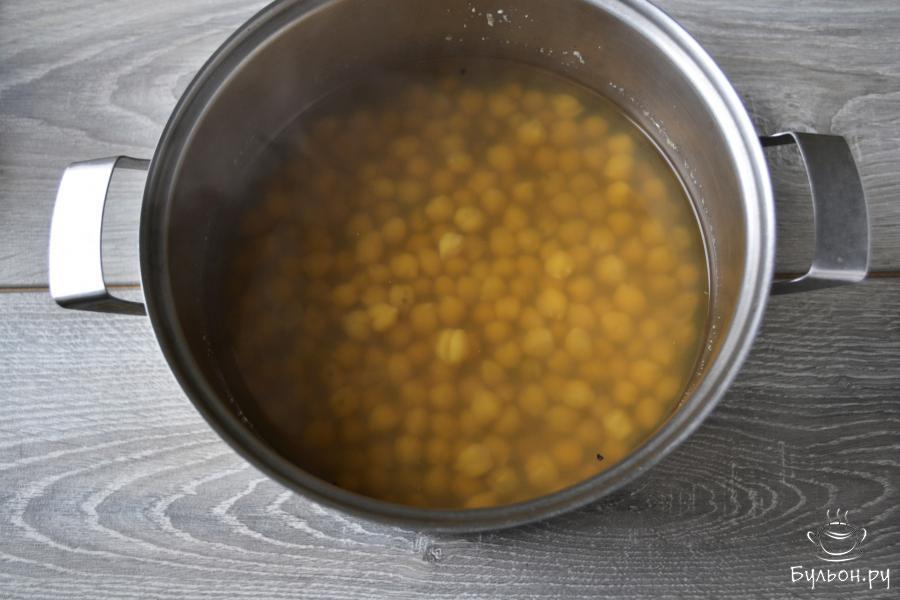 1. Промойте нут, залейте прохладной водой и оставьте на ночь. Утром эту воду слейте. Промойте горох еще раз, залейте чистой водой и сварите в течение 1-1,5 ч. до мягкости нута. Слейте воду с вареного нута.