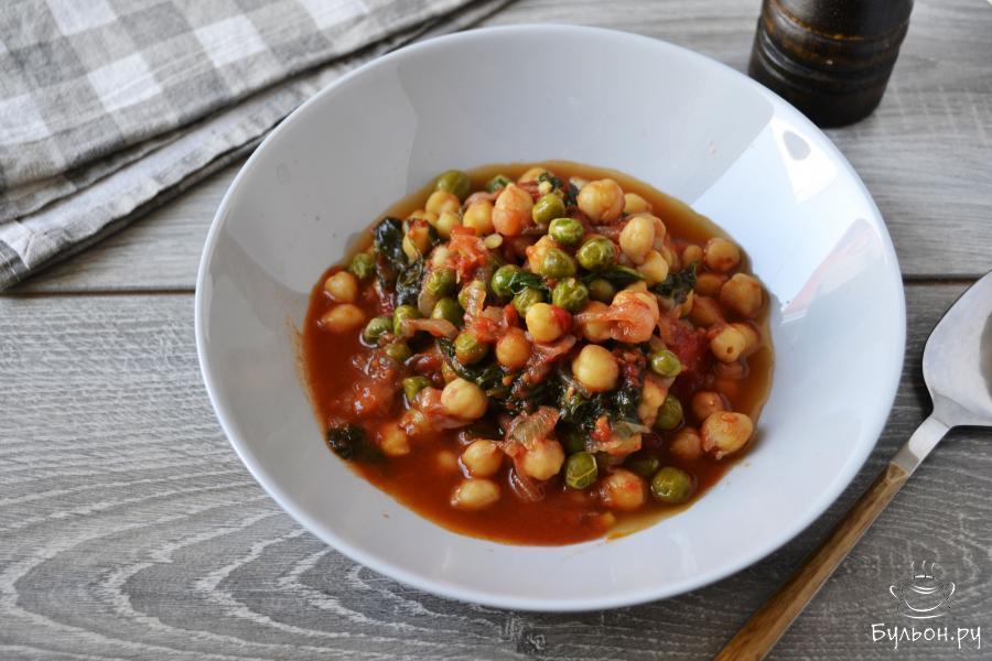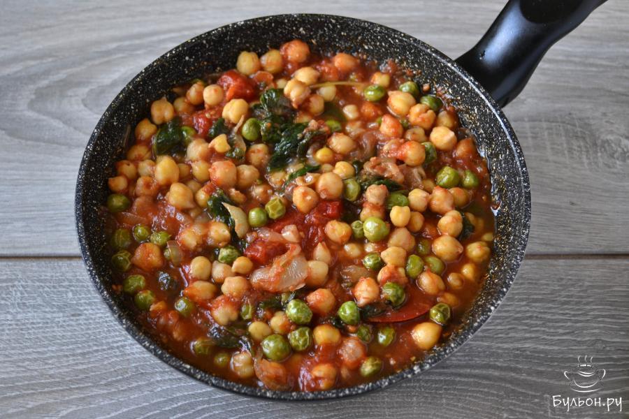 Вареный нут с зеленым горошком, обжаренным луком, шпинатом и томатами на сковороде - блюдо, которое можно подать на постный стол, для вегетарианцев или просто для людей, которые тщательно следят за своим питанием. Это тушеное блюдо получается очень полезное, яркое как по-цвету, так и по-вкусу. Кушанье можно сделать более густым или жидким, в зависимости от количества добавляемых томатов. По желанию, можно добавить любимые специи и приправы.