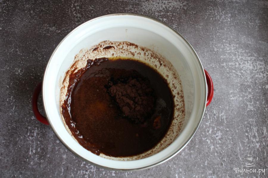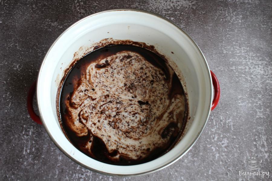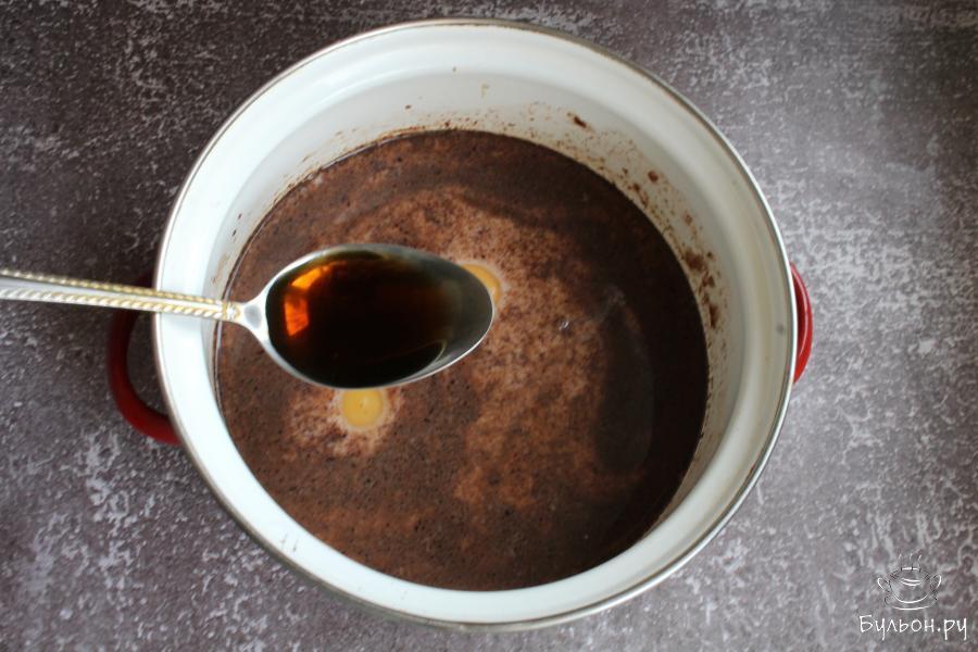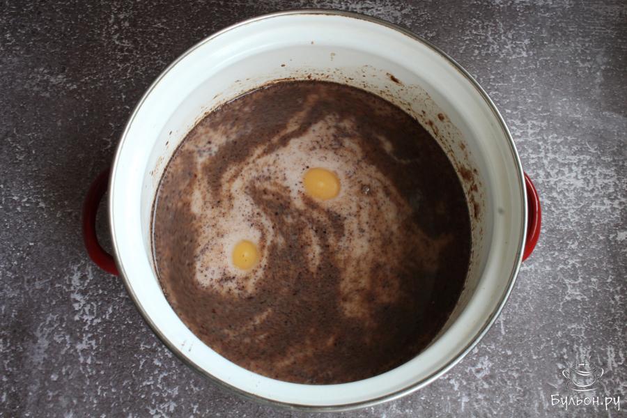 4. Добавить в кастрюльку яйца и перемешать. По желанию добавить сахарную пудру в тесто, либо можно оставить ее и посыпать готовые блинчики.
